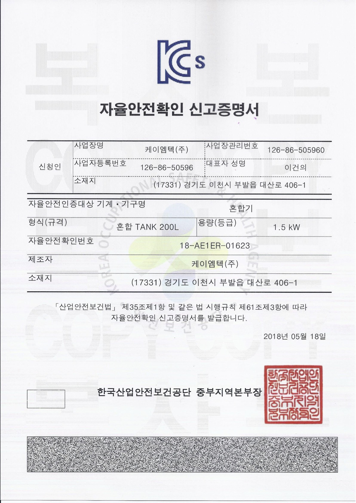 자율안전확인 신고증명서 (혼합 TANK 200L)